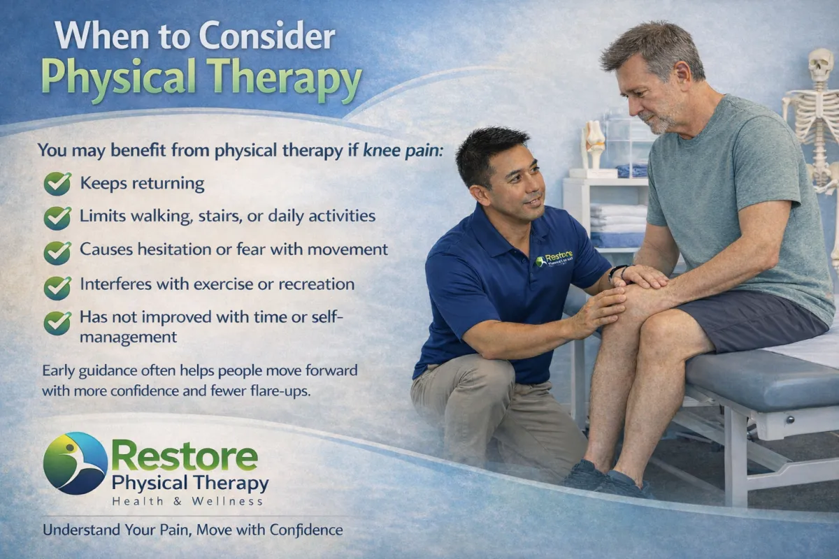 Understanding Knee Pain — why walking, stairs, squatting, and daily movement can become uncomfortable and how Restore Physical Therapy helps guide confident, comfortable movement again.
