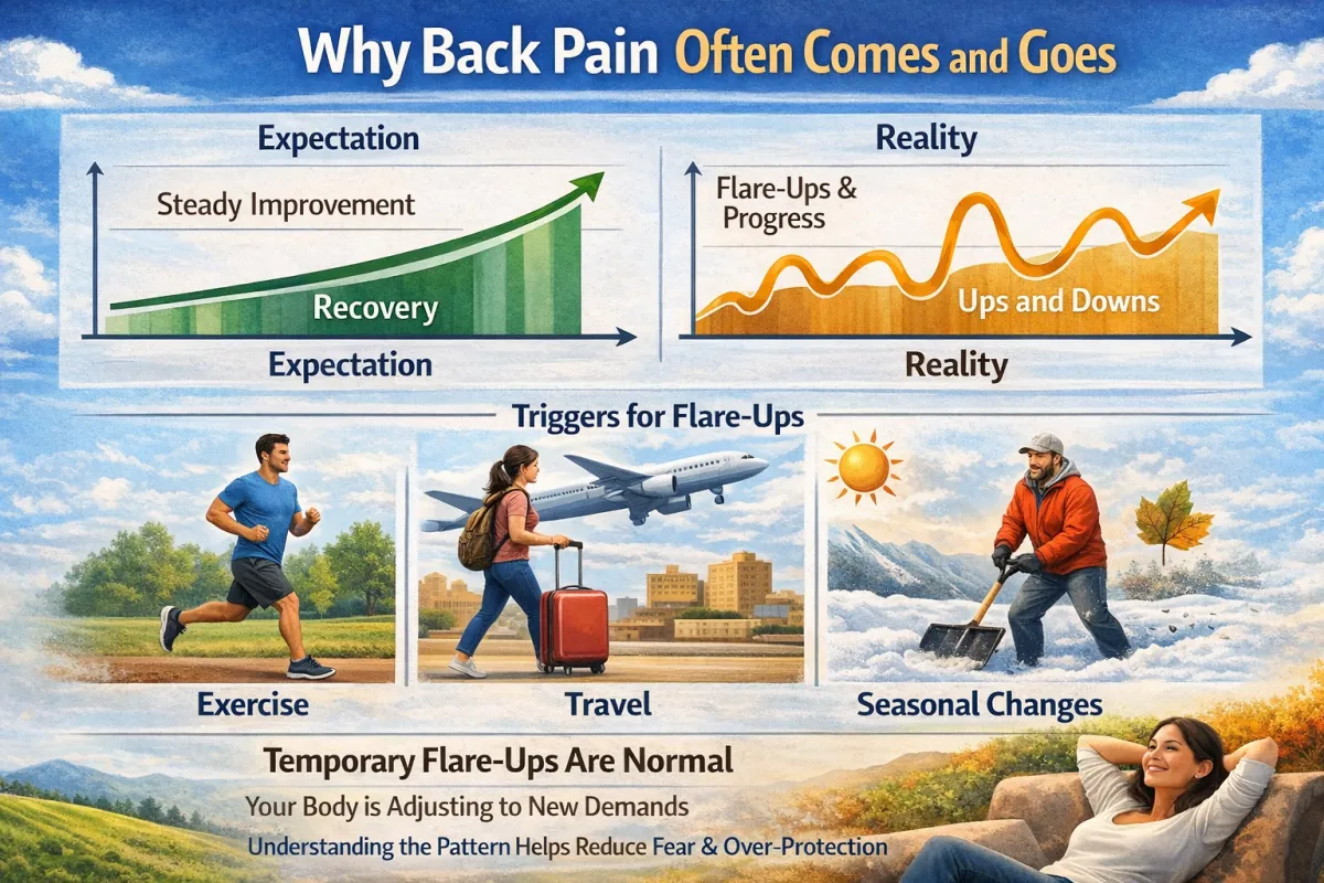Educational infographic showing why back pain has ups and downs and how flare-ups are a normal part of recovery
